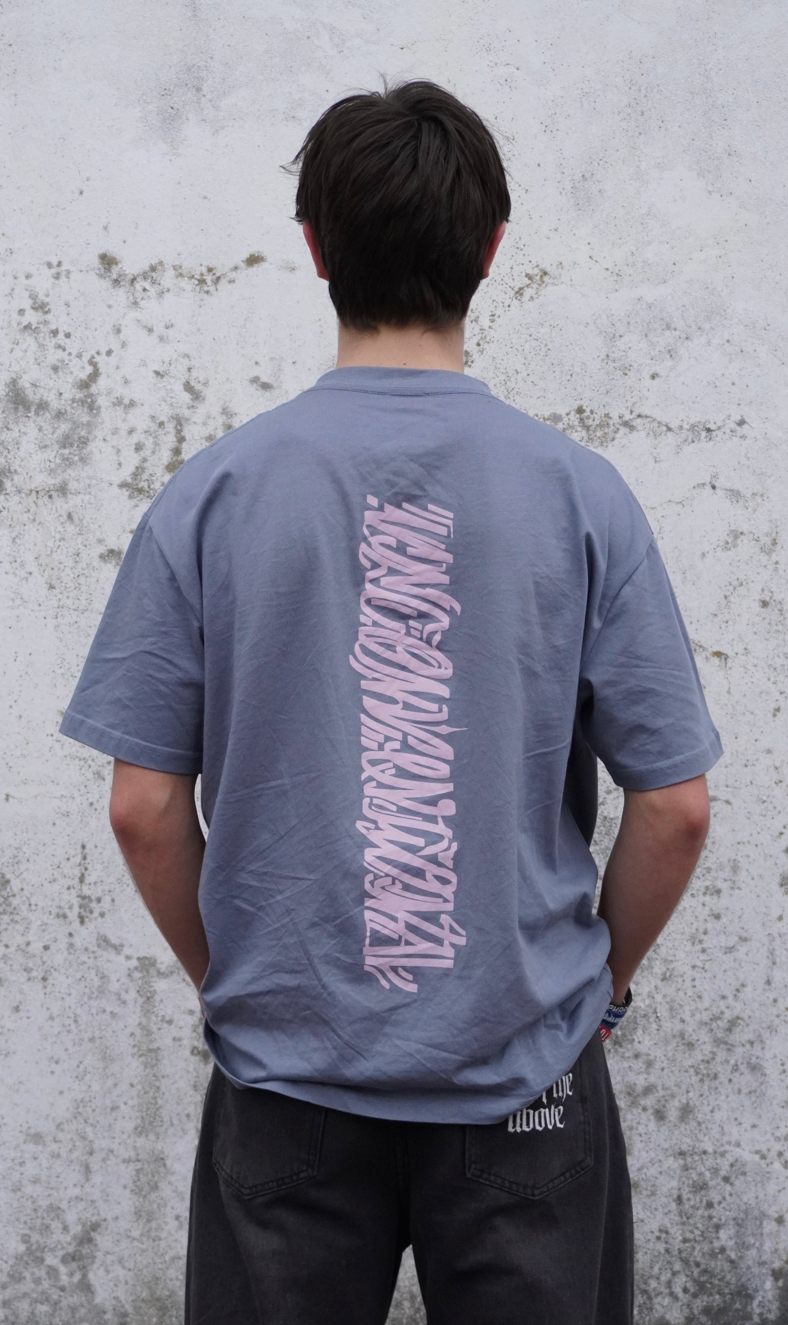 100% Cotton light blue T-shirt, with pink printed Unconventional graphic on the back and dark violet embroidered Moondi logo on the front.