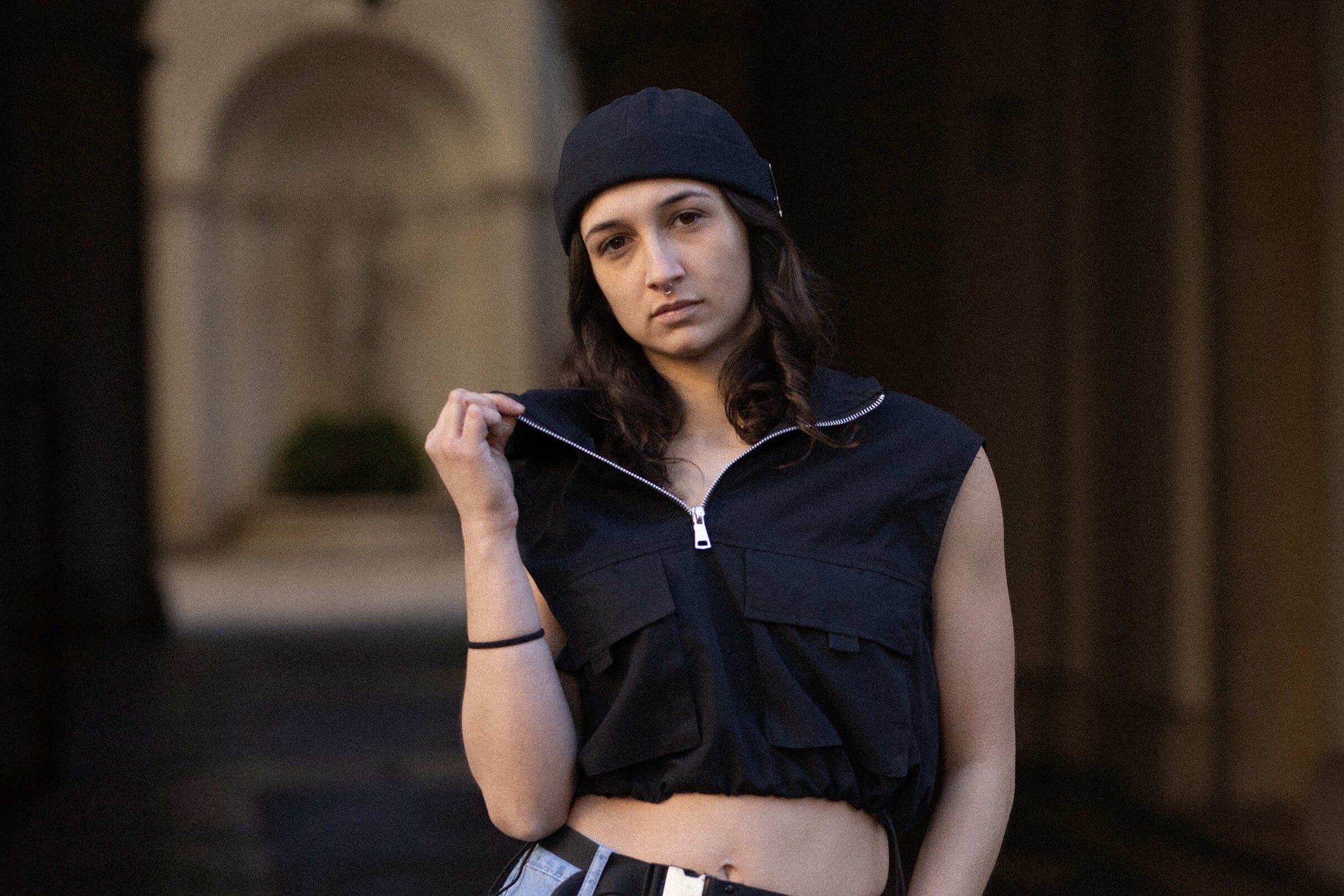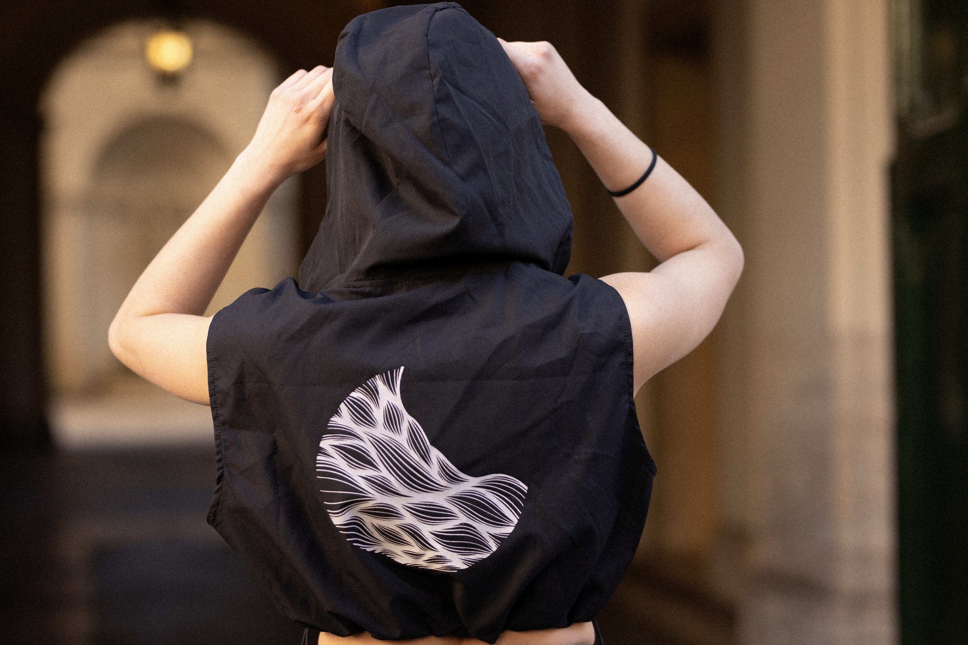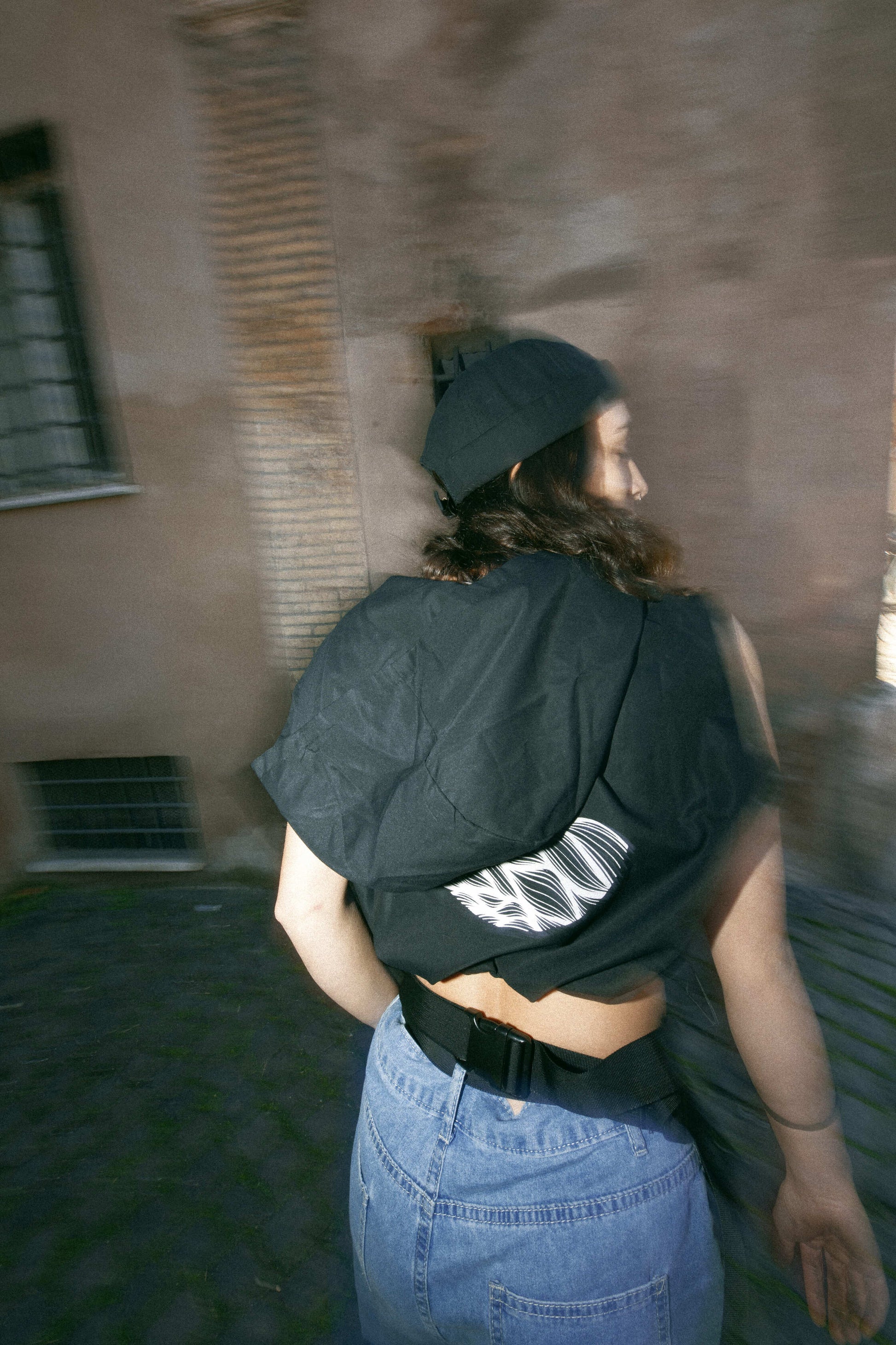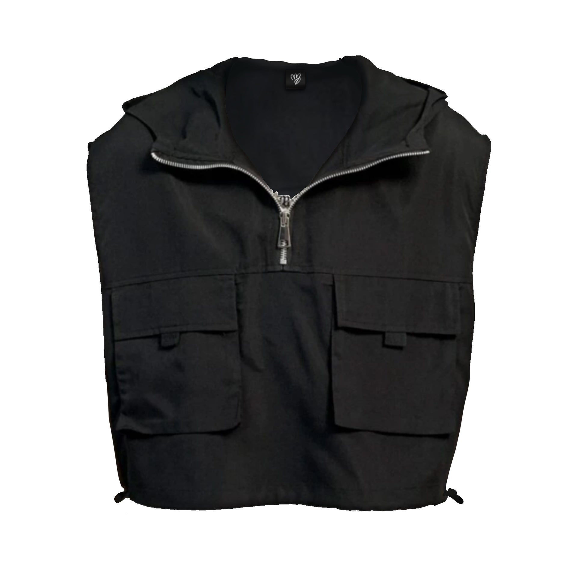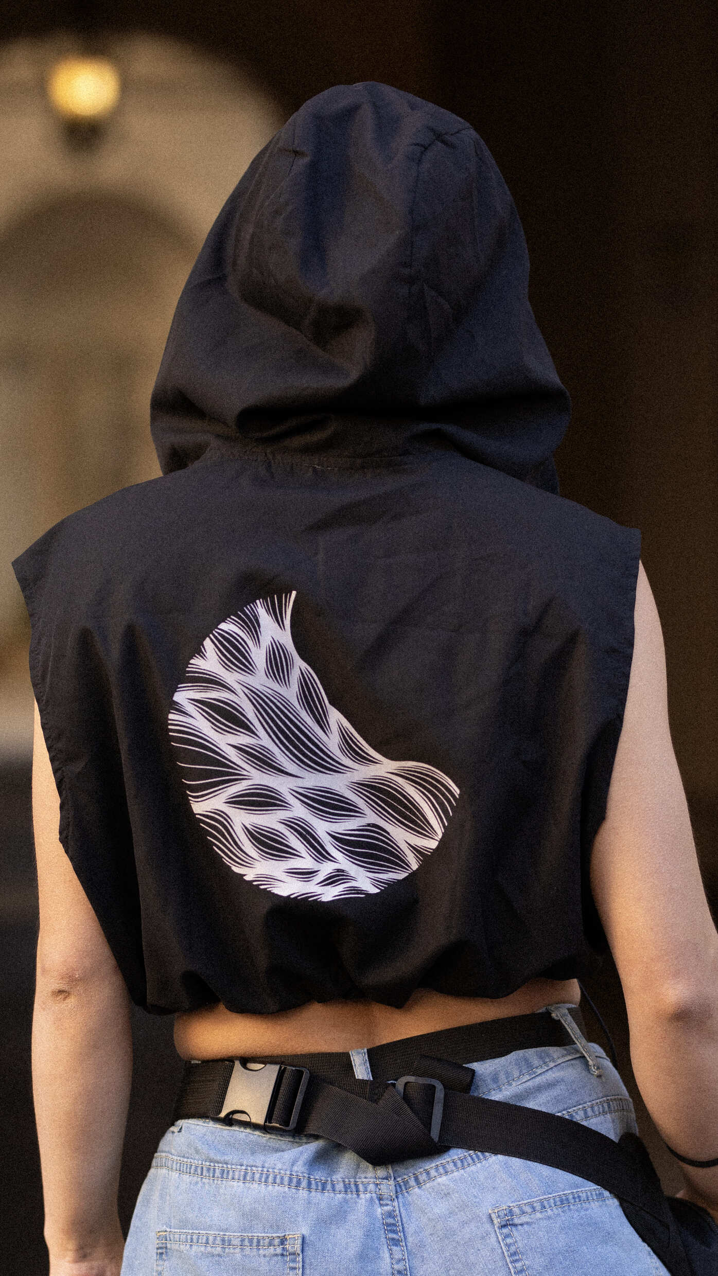 Black crop vest with hoodie and half zip. White clircle wave graphic on thr back and white logo on the front. This vest has limited pieces, enjoy it before the sold out!