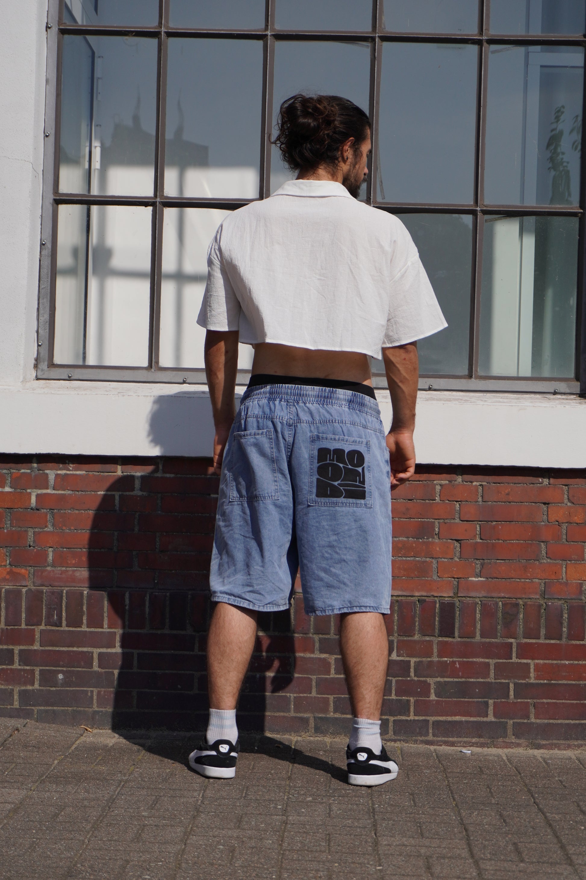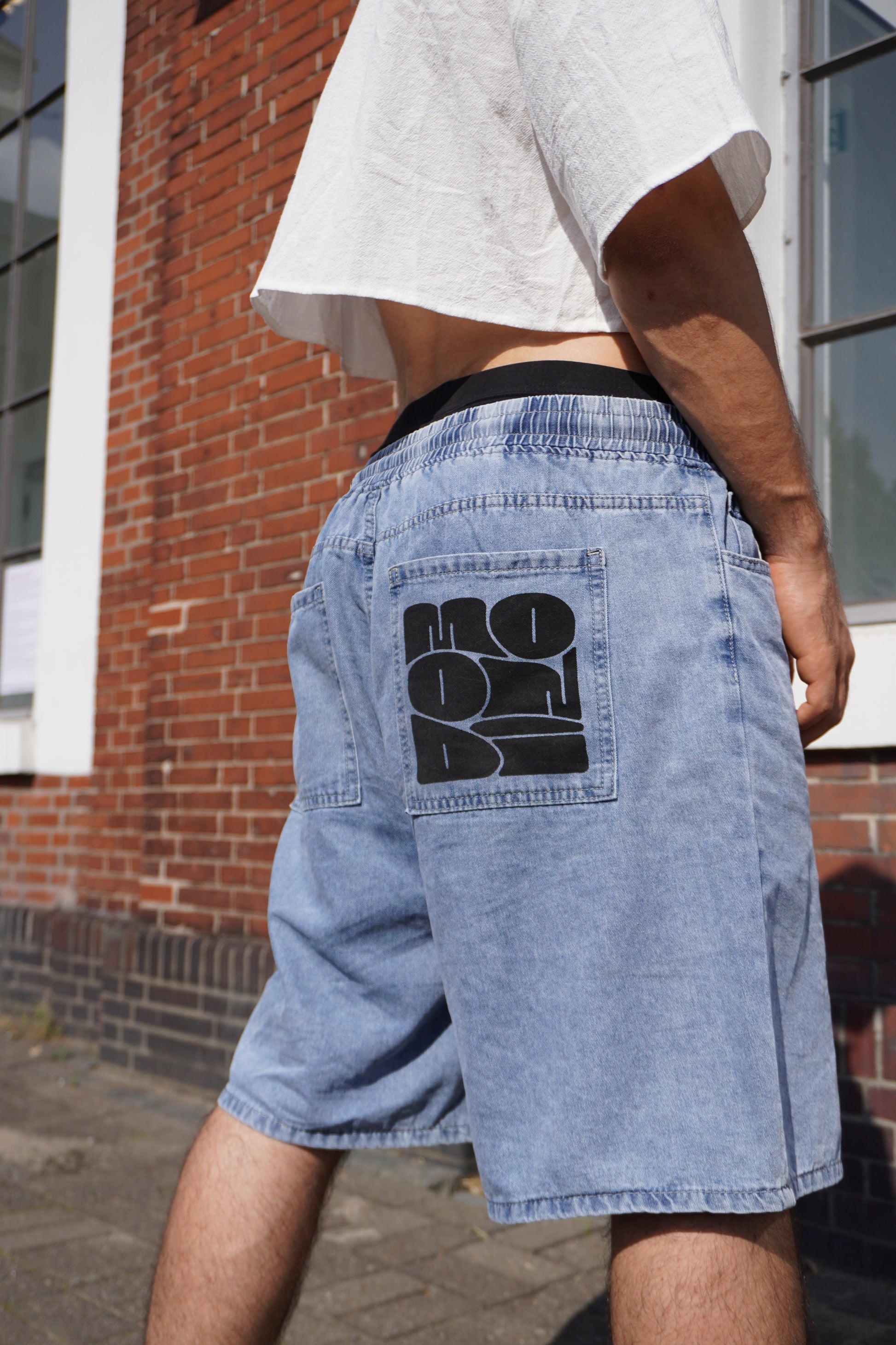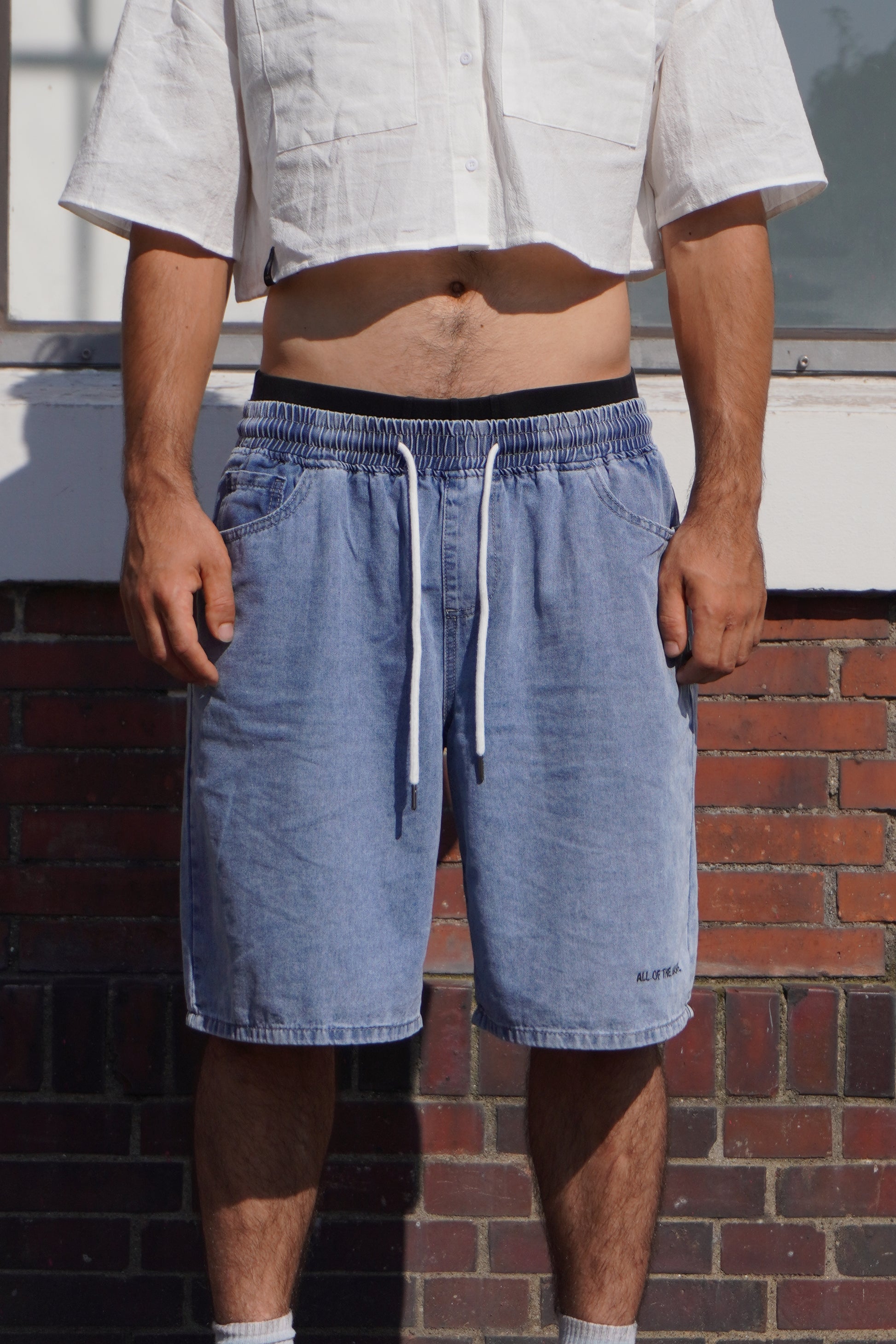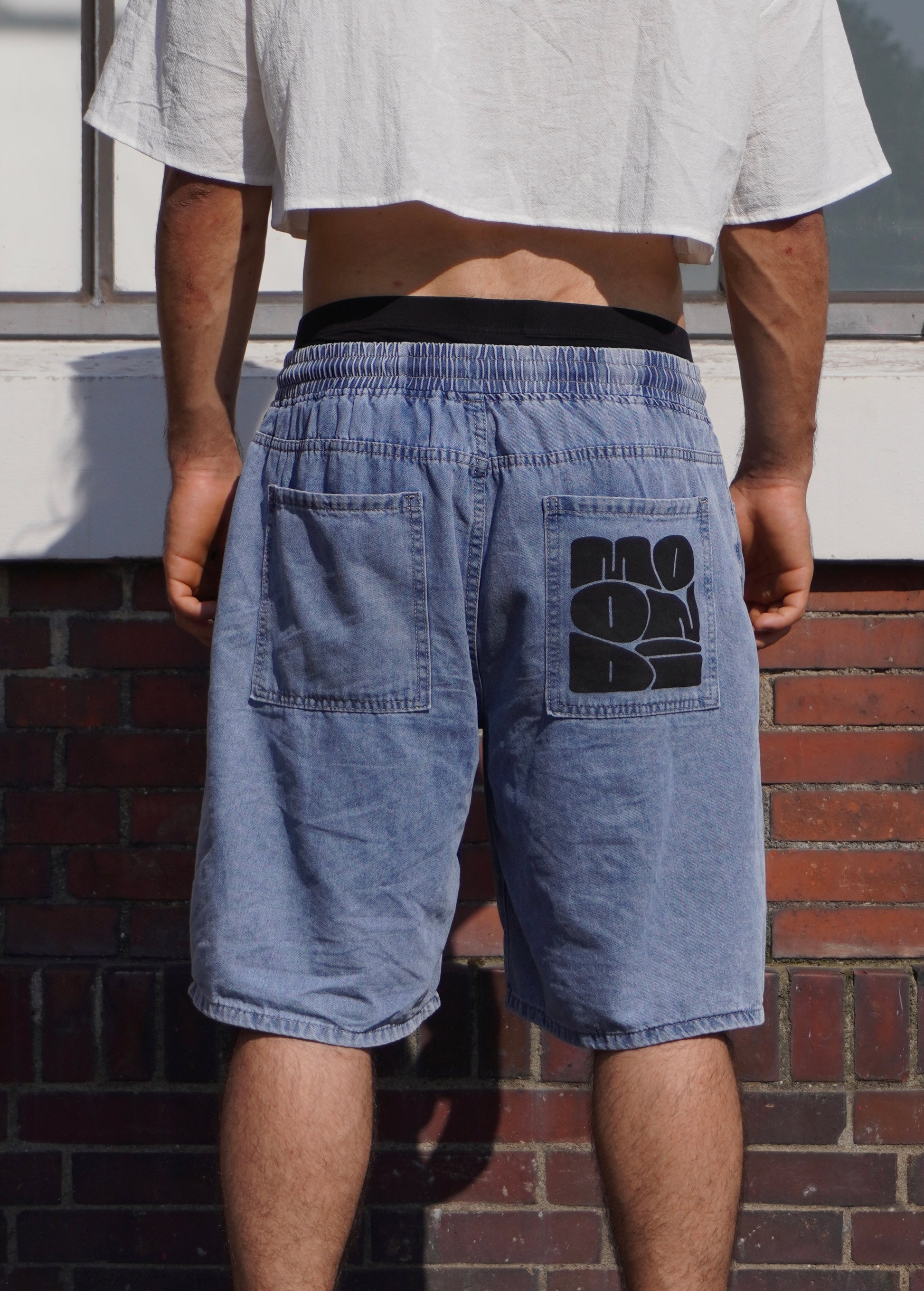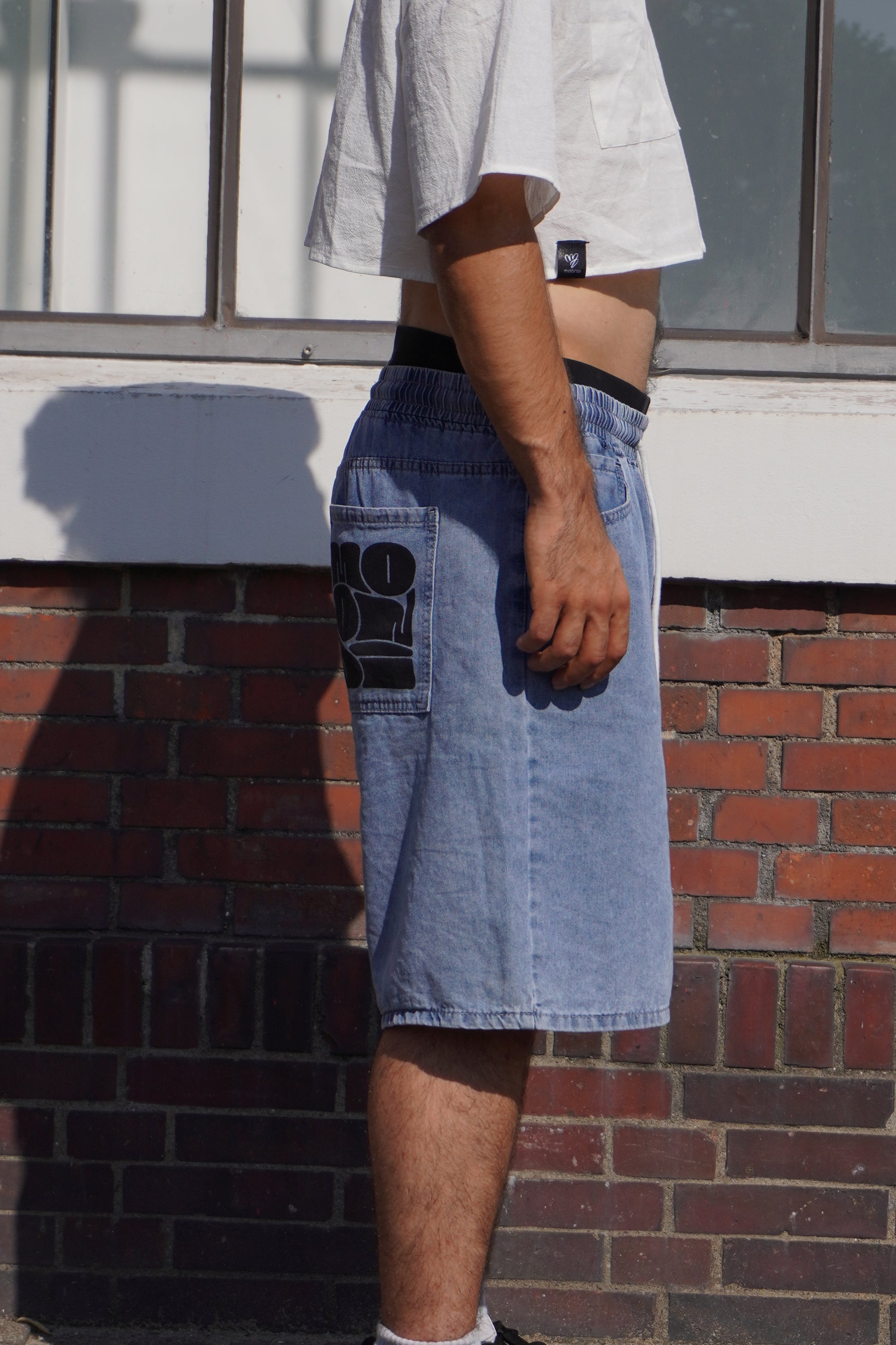 These unisex blue jeans shorts are perfect for any occasion. The elastic waist provides a comfortable fit, while the white lace adds a touch of style. The hand printed serigraphy graphic on the back pocket adds a unique and trendy element. Enjoy the combination of comfort and style with these jeans shorts. The embroidered sentence at the bottom edge is random, so you can have a unique pair. All the sentences’ meanings have a connection to the parkour practice, one of the them is “Last one, for real”.