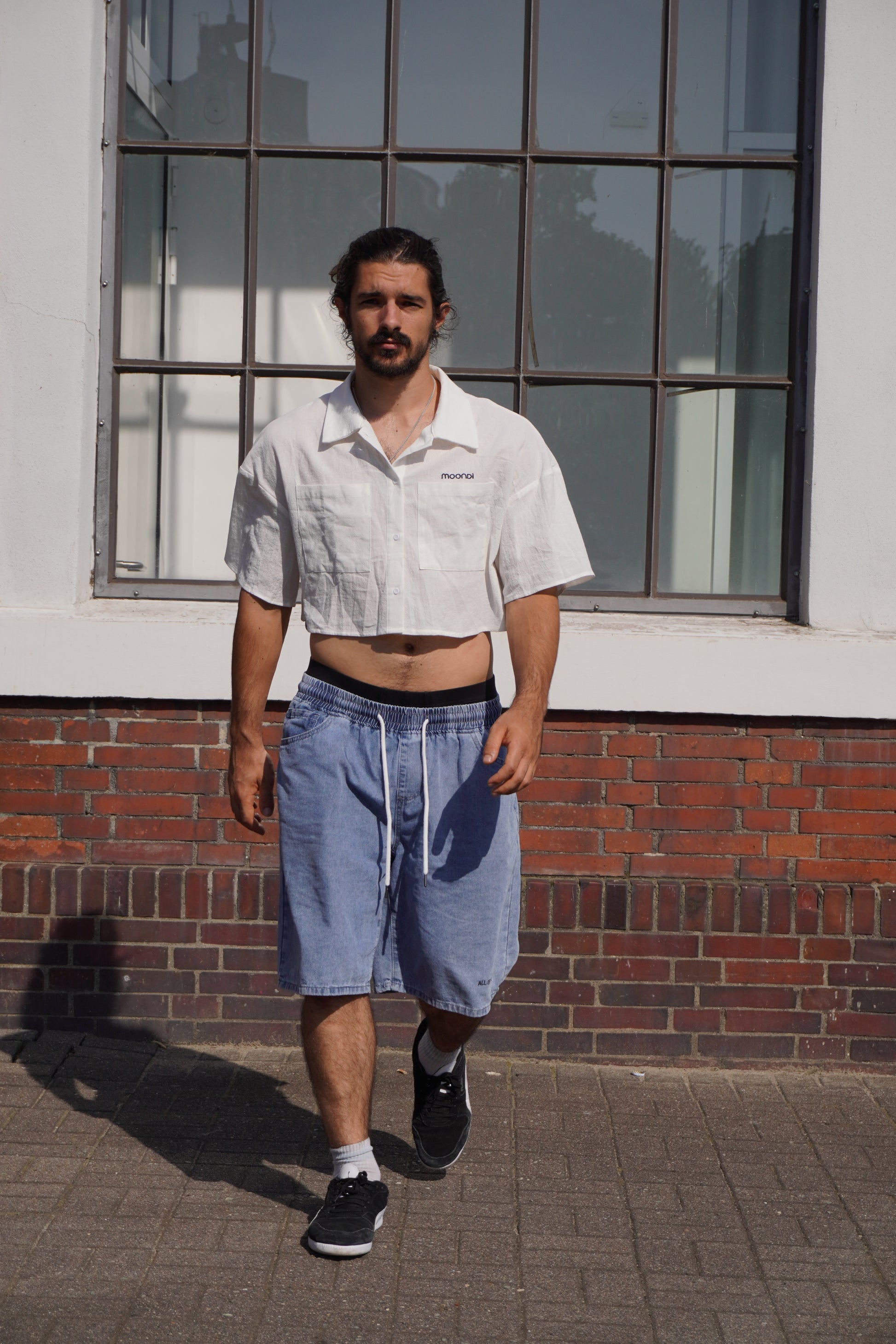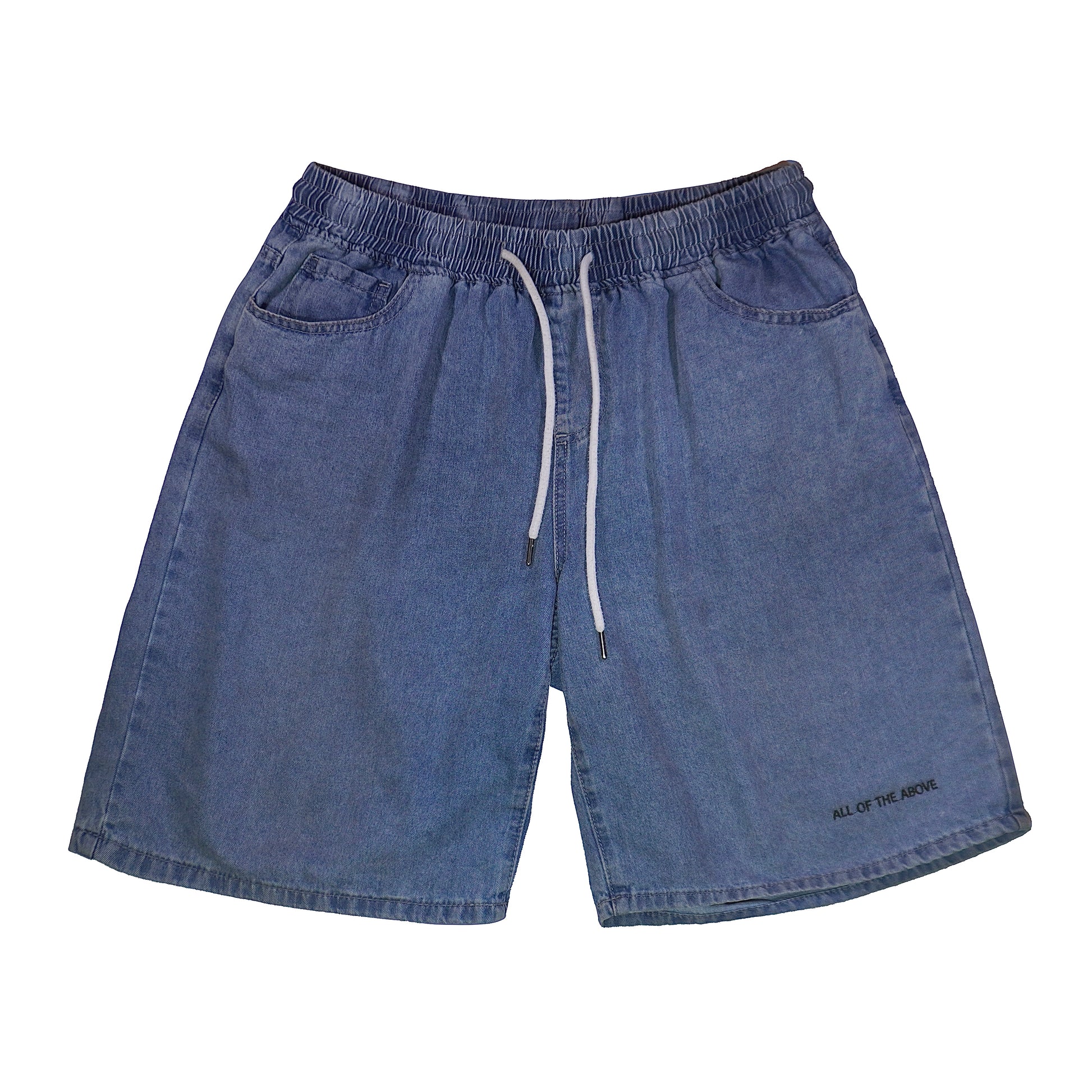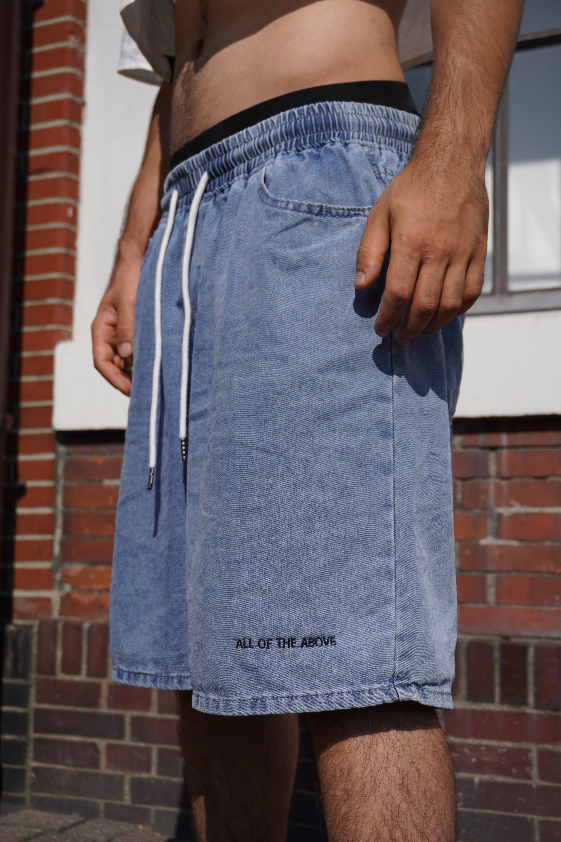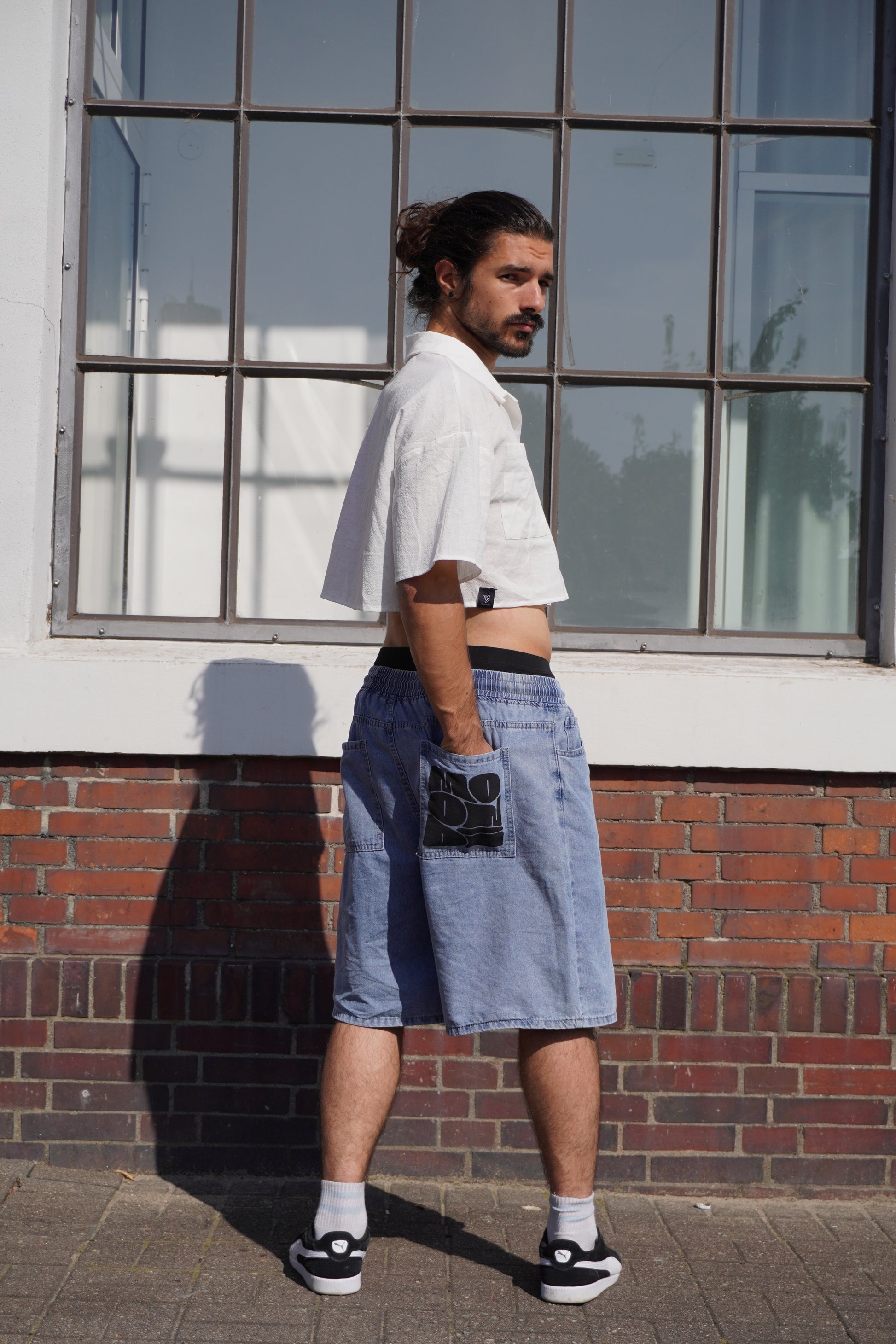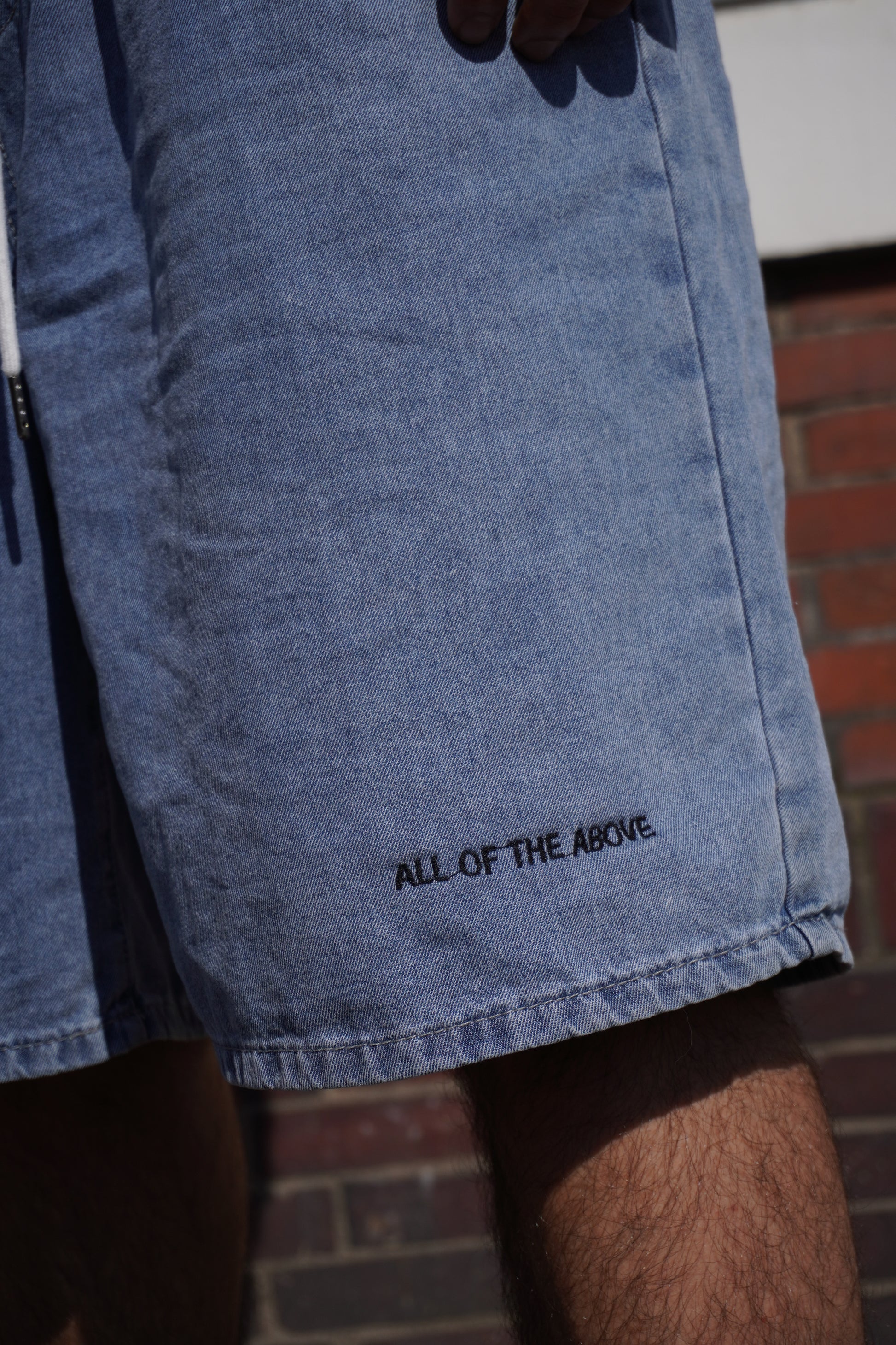 These unisex blue jeans shorts are perfect for any occasion. The elastic waist provides a comfortable fit, while the white lace adds a touch of style. The hand printed serigraphy graphic on the back pocket adds a unique and trendy element. Enjoy the combination of comfort and style with these jeans shorts. The embroidered sentence at the bottom edge is random, so you can have a unique pair. All the sentences’ meanings have a connection to the parkour practice, one of the them is “Last one, for real”.