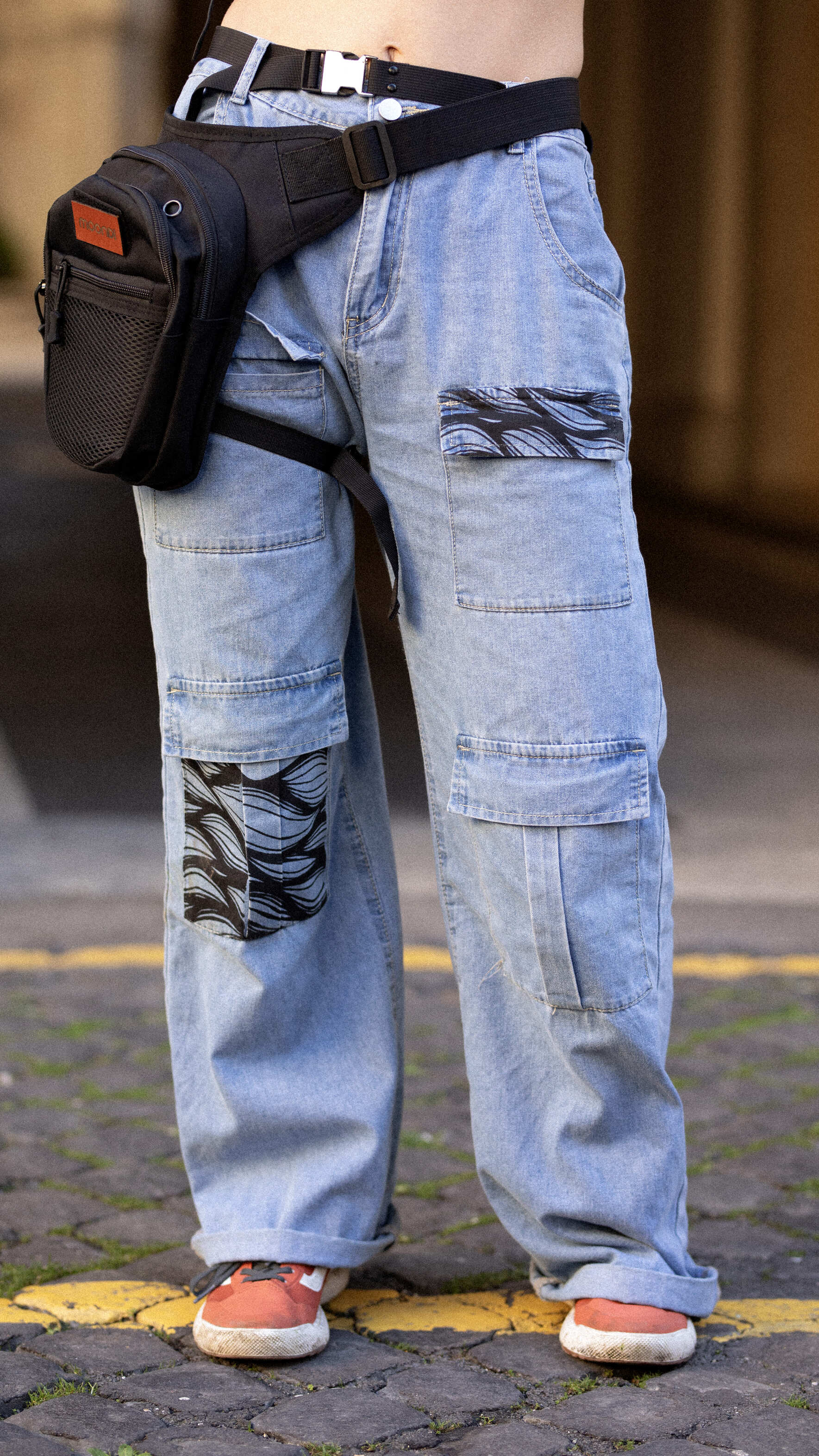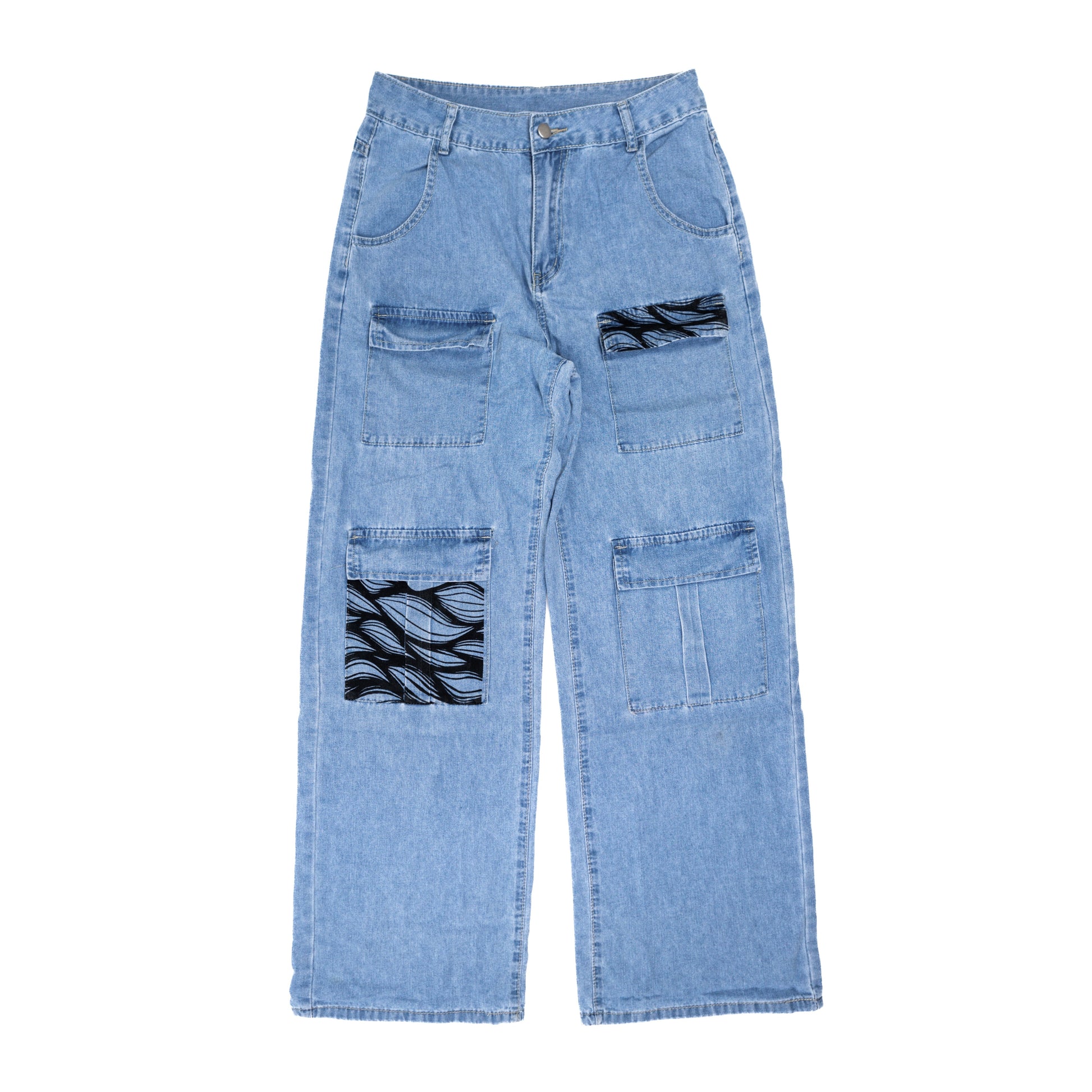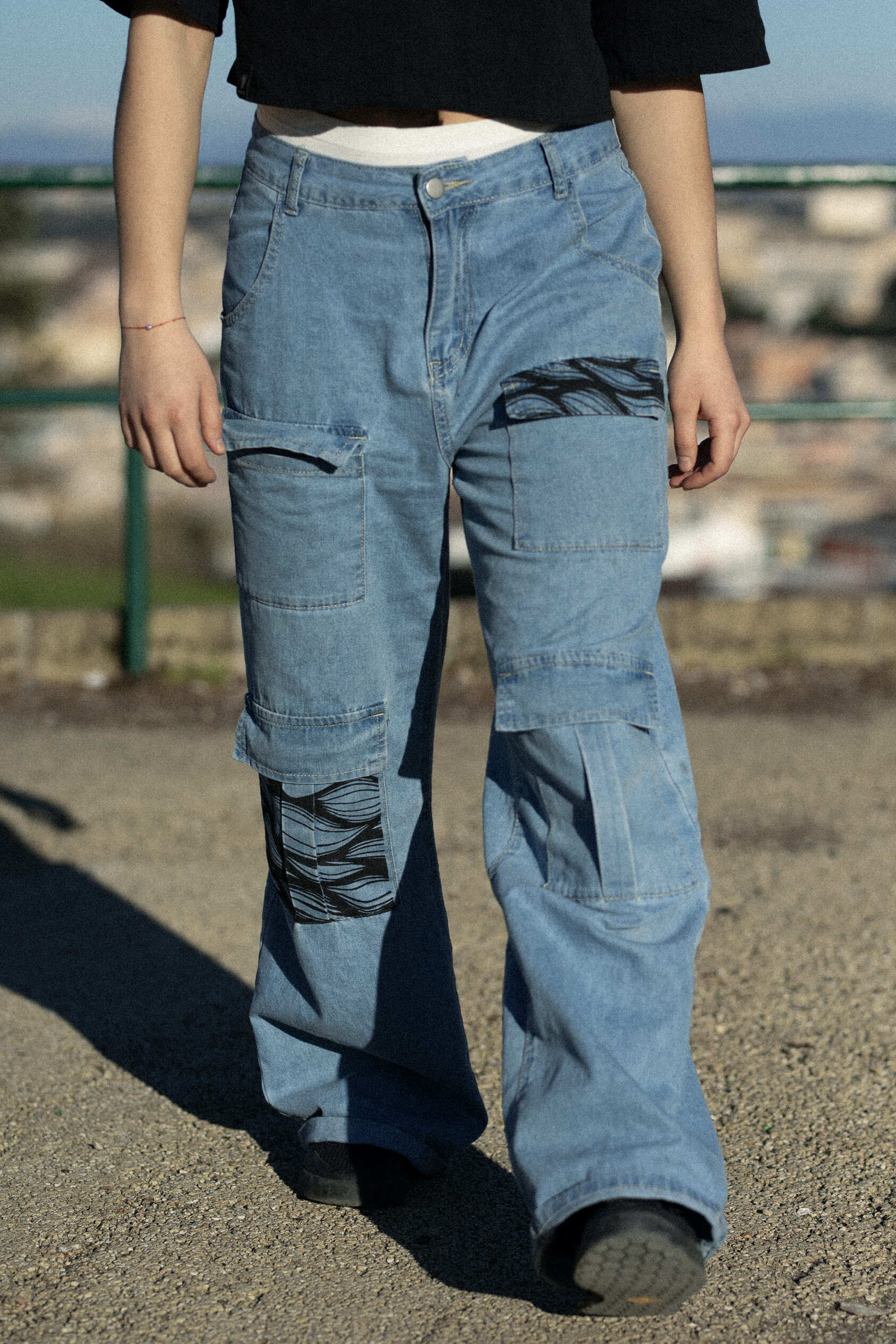 Elevate your style with UNIQUE & LIMITED Jeans Cargodesgned for women. Handcrafted wave graphics adorn the multiple pockets of these high-waisted jeans, adding a unique touch to your look. With soft, comfortable fabric, these jeans provide both fashion and function. Upgrade your wardrobe today! Check the size guide at the end of the images to find your fit!